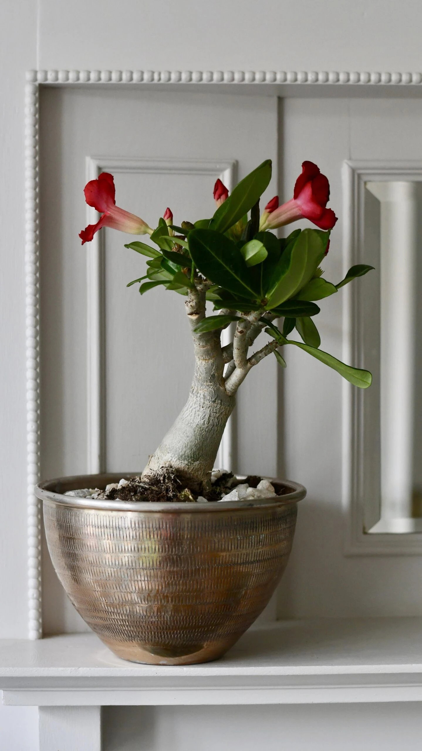 The Desert Rose is a deciduous succulent with glossy green leaves and red-pink flowers. It has a widespread native distribution in Africa and the Arabian Peninsula. Even though bright, full sun stimulates blossom production, the Desert Rose plant takes a break during the very hottest and rainiest months of the season. This results in two periods of blooming. You’ll see flowers begin to develop in early spring. With the right amount of light, your plant should bloom steadily until mid-summer.