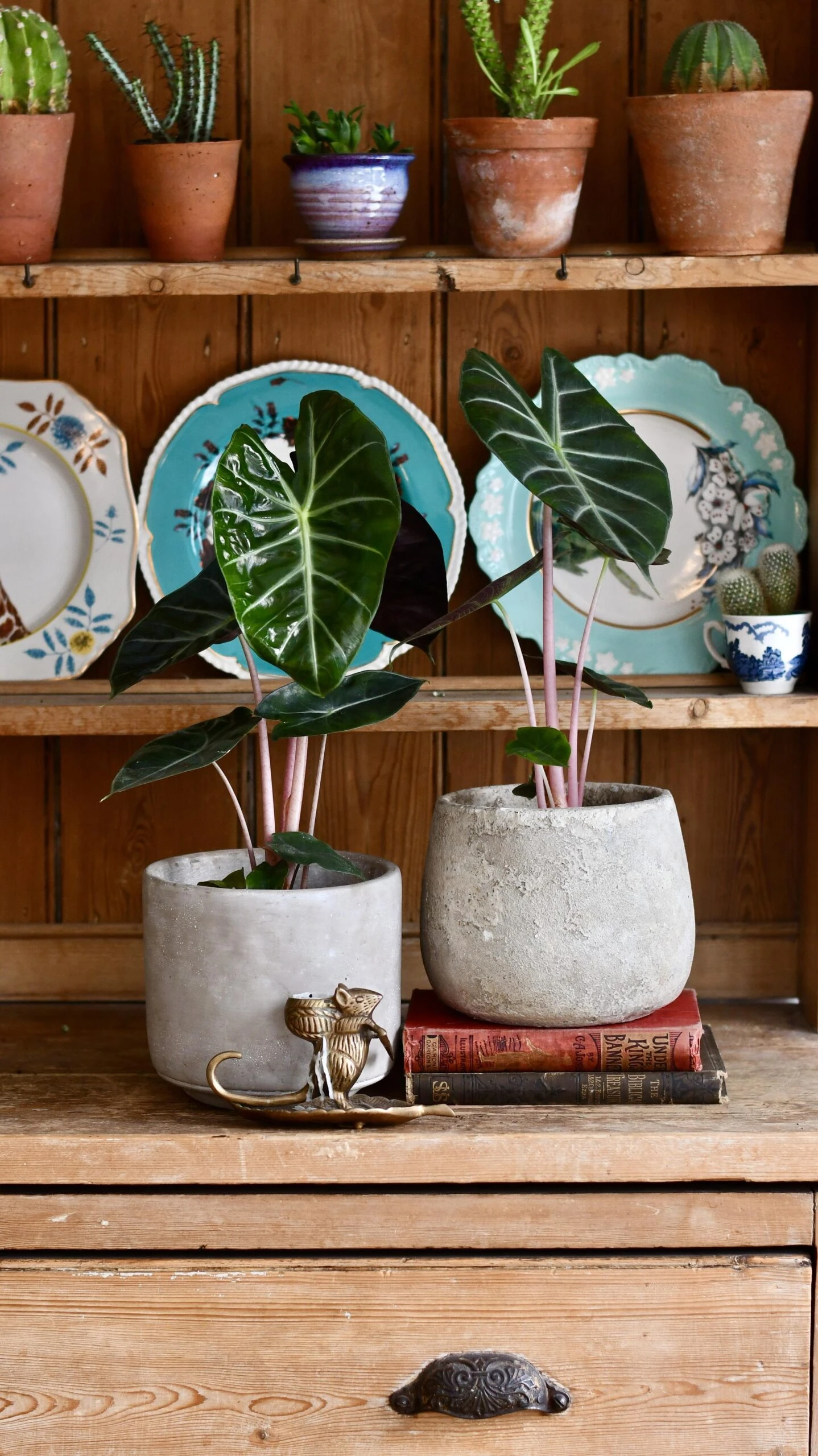 The Pink Dragon likes bright, filtered light, away from direct sun. The leaves are prone to getting sunburnt and will start to look dull if exposed to the sun. Coming from a tropical environment, these Alocasias like humidity, sit on a tray of pebbles topped up with water to boost the level of moisture in the air. Keep the leaves dust-free and mist them every once in a while.