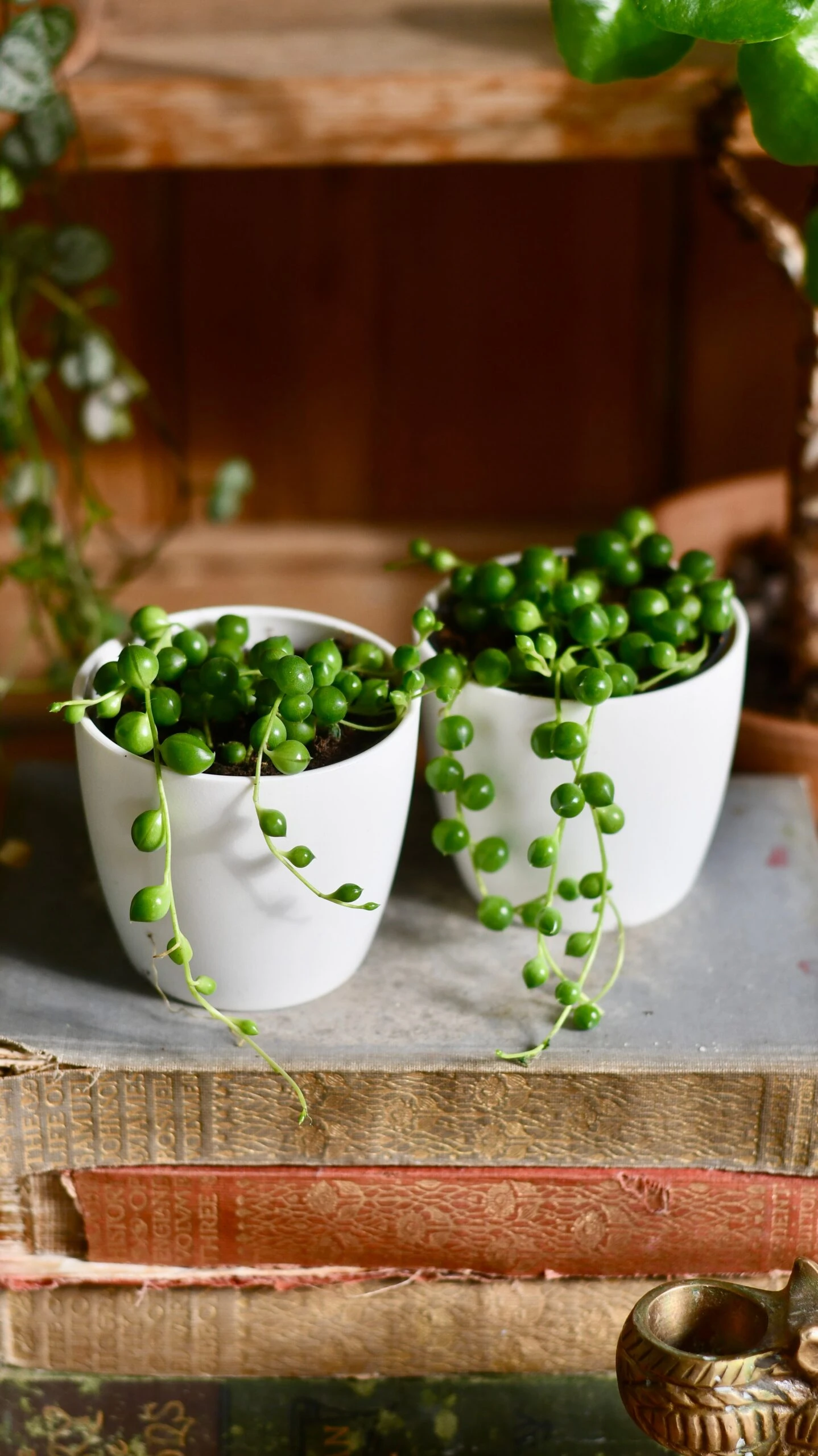 To style the String of Pearls, consider pairing it with plants that have a contrasting texture, such as a plant with broader leaves or a different colour foliage. The plant also pairs well with natural materials, such as wood or woven baskets, which complement its earthy tones.